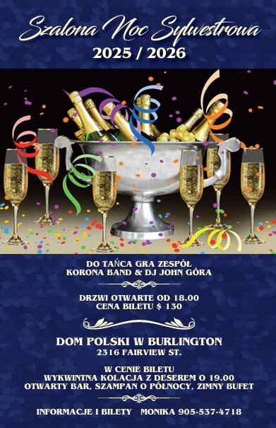 Dom Polski w Burlington seredeczne zaprasza na Bal Sylwestrowy. Cena biletu od osoby $ 130. Wykwintna kolacja z deserem o 19:00, otwarty bar, szampan o polnocy, zimny bufet.Do tanca gra Korona Band and DJ John Gora. Po bilety dzwon: Monika 905-537-4718