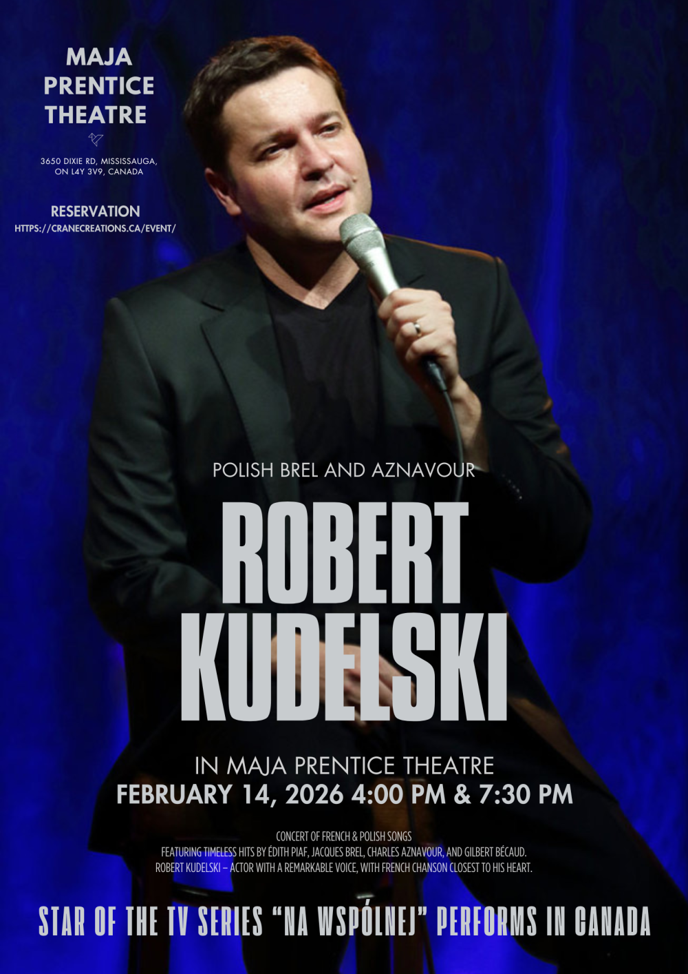 GWIAZDA SERIALU ,,Na Wspólnej” WYSTĄPI W KANADZIE! Z wielką radością zapraszamy Państwa na koncert Roberta Kudelskiego, który odbędzie się w Maja Prentice Theatre w Mississauga. To wyjątkowe wydarzenie — pierwsze muzyczne spotkanie artysty z publicznością w Kanadzie. 14 lutego 2026 – Walentynki 4:00 PM 7:30 PM Maja Prentice Theatre | Mississauga W programie: romantyczny, nastrojowy wieczór z piosenką francuską …oraz innymi muzycznymi niespodziankami ️ Zapraszamy Polonię kanadyjską oraz wszystkich miłośników muzyki do spędzenia z nami tego niezwykłego, pełnego emocji wieczoru. Będzie nam niezwykle miło Państwa gościć. Bilety: https://cranecreations.ca/event/
