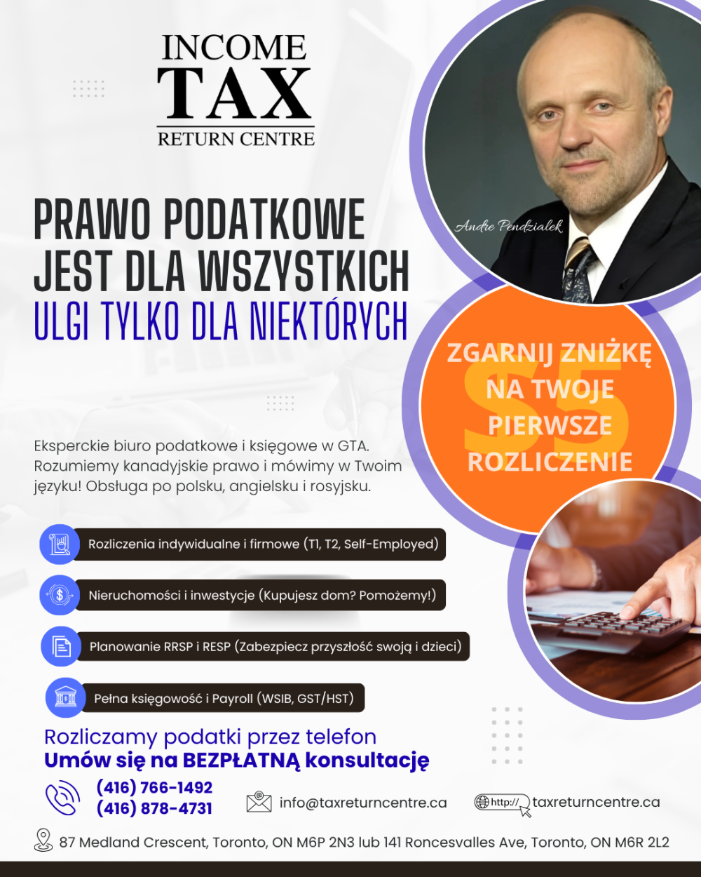 W Income Tax Return Centre od lat pomagamy kanadyjskiej Polonii, nowoprzybyłym rodakom oraz seniorom przejść przez sezon podatkowy bez stresu i z maksymalnym zwrotem. Wyjaśnimy Ci wszystko krok po kroku – w pełni po polsku!W czym możemy Ci pomóc?Rozliczenia indywidualne (Personal Tax): Szybka i bezpieczna wysyłka elektroniczna (E-FILE).Mały biznes i Self-Employed: Pełna księgowość, rozliczenia T4, GST/HST.Planowanie finansowe: Pomoc w optymalizacji kont RRSP oraz RESP.Pomoc dla Nowoprzybyłych: Pierwsze rozliczenie w Kanadzie? Doradzimy, jak zrobić to dobrze i nie stracić na benefitach. Odbierz $5 ZNIŻKI na hasło "Bejsment"!