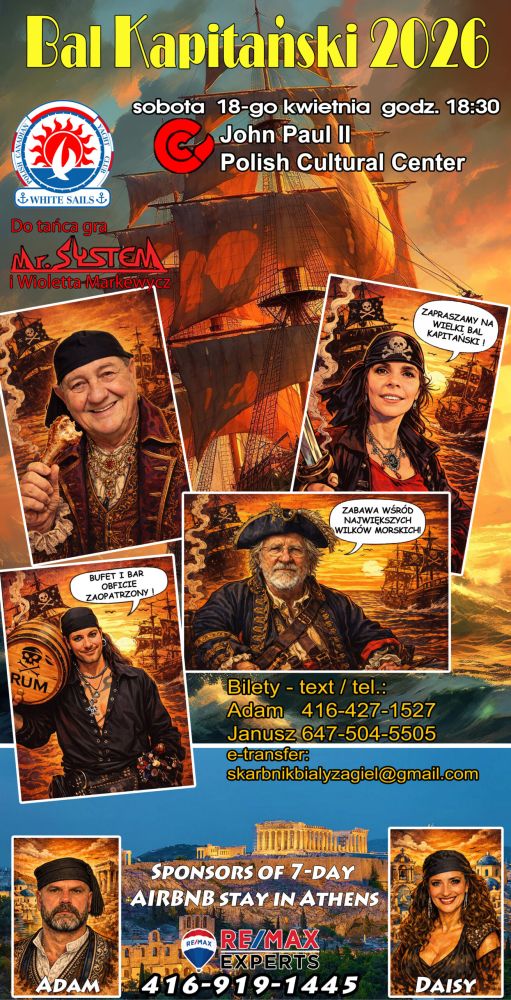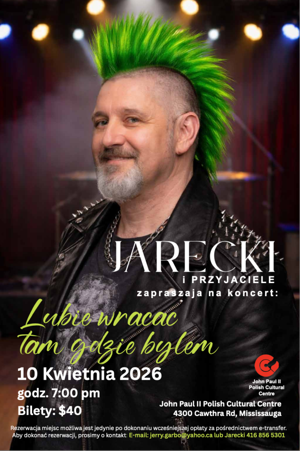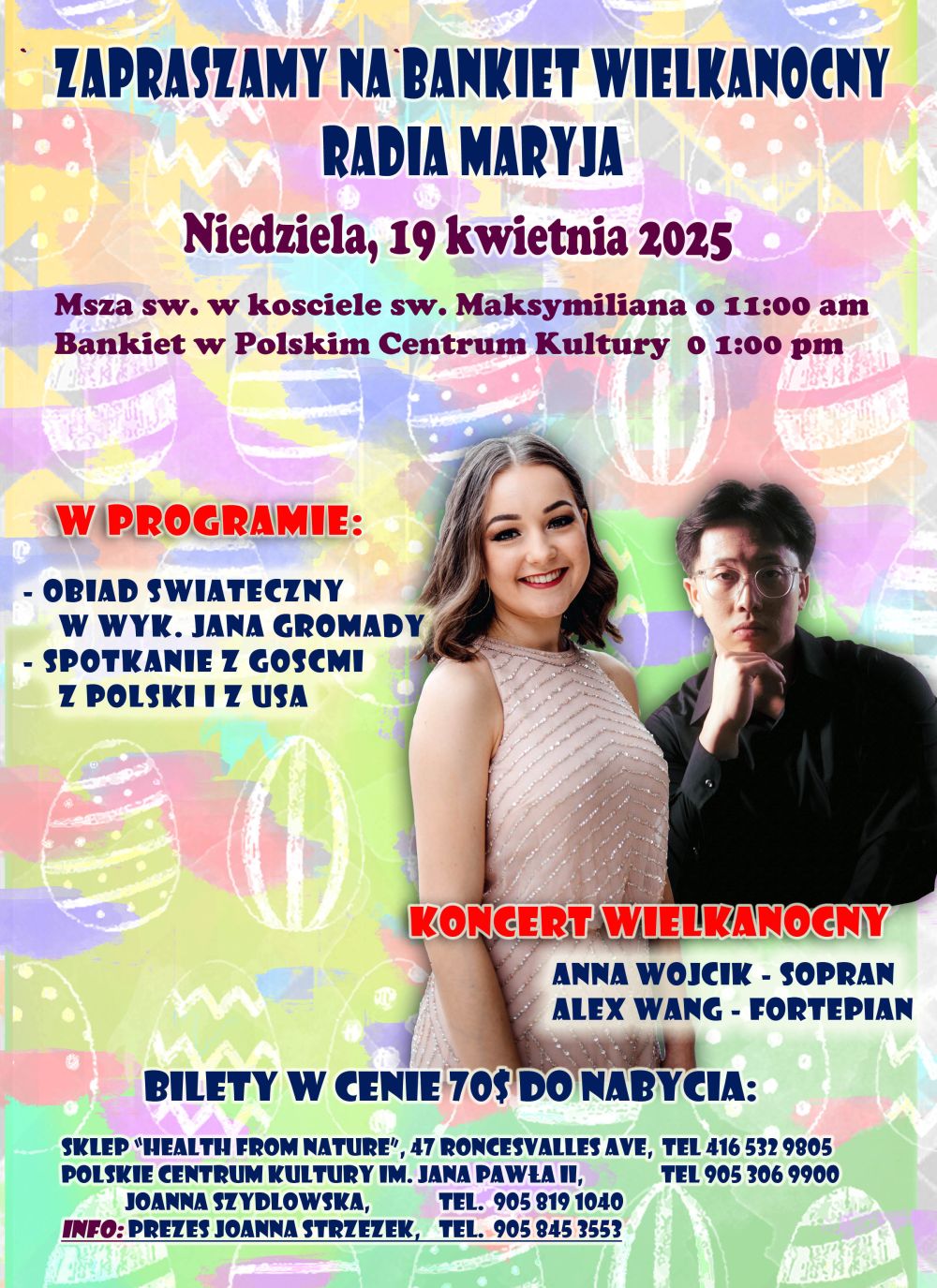 Serdecznie zapraszamy wszystkich Państwa na Bankiet Wielkanocny Radia Maryja, w niedzielę 19 kwietnia: 11:00 pm msza św w kościele św. Maksymiliana Kolbe, 01:00 pm bankiet w Polskim Centrum Kultury. W programie oprócz innych atrakcji koncert, w którym wystąpią: Anna Wójcik – sopran oraz Alex Wang - fortepian. Zapowiada się więc piękny koncert, jak zawsze dbamy o miłą rodzinną atmosferę, tradycyjny obiad świąteczny przygotuje Jan Gromada. Będą też goście z Polski.Rezerwacje i bilety w cenie 70$: Joanna Szydłowska 905 819 1040, oraz Joanna Strzezek 905 845 3553, a także w polonijnym sklepie „Health from Nature” przy Roncesvalles oraz w Polskim Centrum Kultury. Serdecznie zapraszamy.